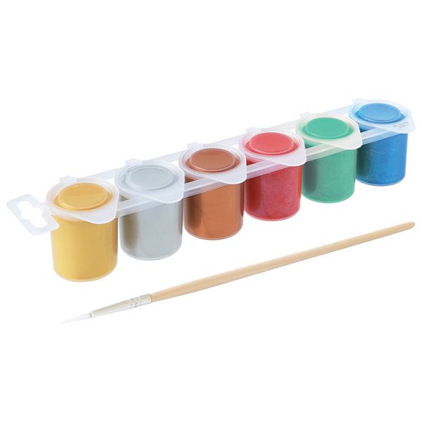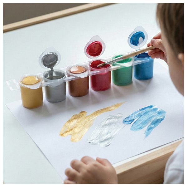 6 boja po 25 ml, plastične čaše i kist, gotova mješavina tempera najfinije kvalitete, može se koristiti na različitim vrstama površina kao što su: papir, karton, drvo, tekstil, staklo, terakota, metal i plastika, može se fiksirati lakom ili drugim prikladnim proizvodom, mrlje treba odmah ukloniti, blister
