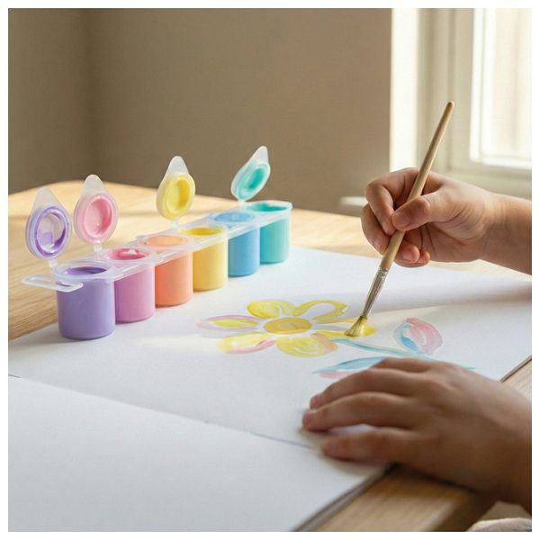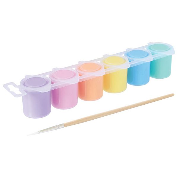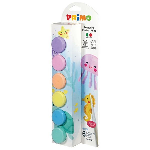 6 boja po 25 ml, plastične čaše i kist, gotova mješavina tempera najfinije kvalitete, može se koristiti na različitim vrstama površina kao što su: papir, karton, drvo, tekstil, staklo, terakota, metal i plastika, može se fiksirati lakom ili drugim prikladnim proizvodom, mrlje treba odmah ukloniti, blister