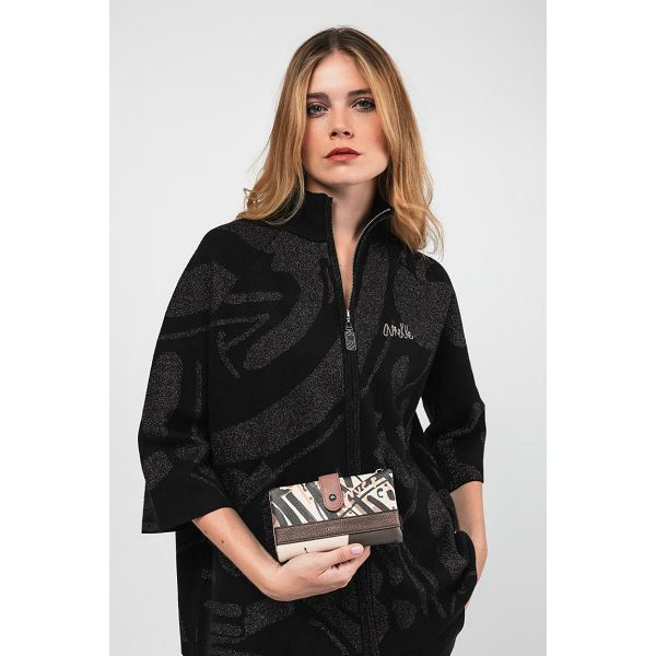 Novčanik je podijeljen u dva dijela i zatvara se patentnim zatvaračem sprijeda te preklopom i drukerom straga. Unutrašnjost ženskog novčanika usklađena je bojama, a integrirana tekstilna podstava također savršeno nadopunjuje kolekciju.