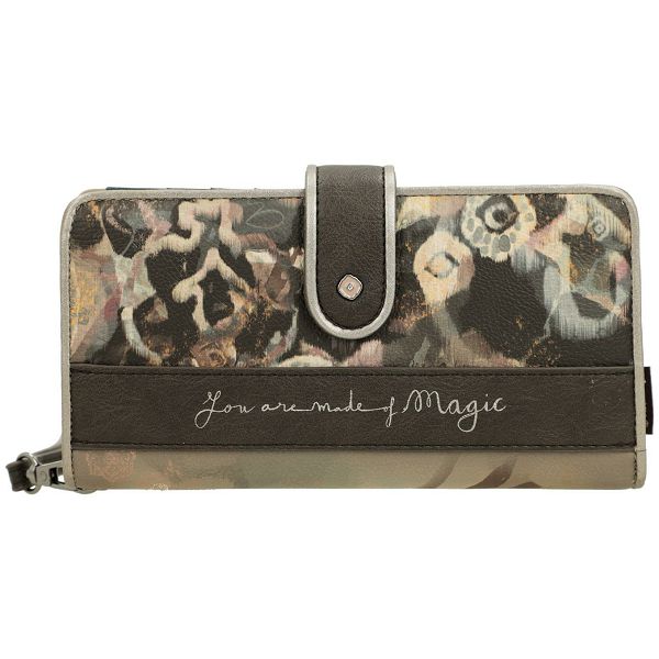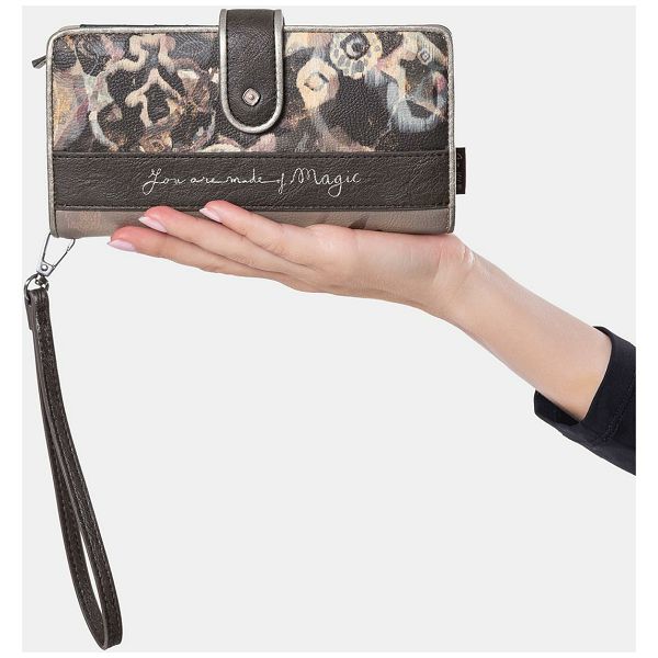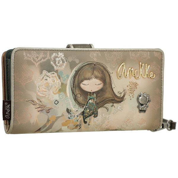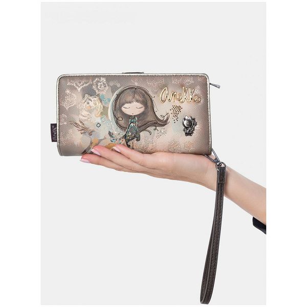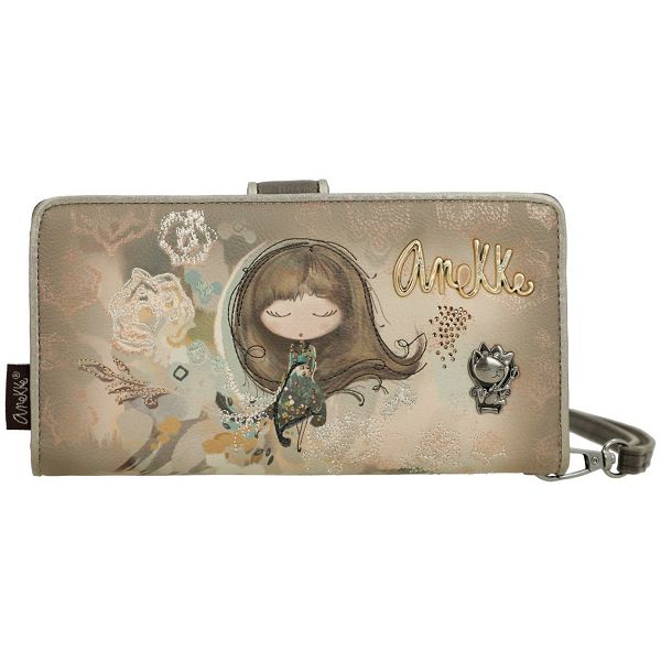 Izrađen od glatke umjetne kože, prednja strana ovog ženskog novčanika krasi prepoznatljivi print sanjive Anekke. Blistavi cirkoni krase njezinu haljinu s uzorkom. Nježan vez i apstraktni oblici u pozadini prekrasno nadopunjuju motiv. Zlatni natpis Anekke također se besprijekorno stapa s jesenskim dizajnom novčanika.