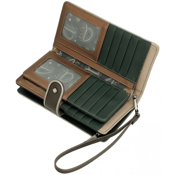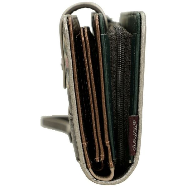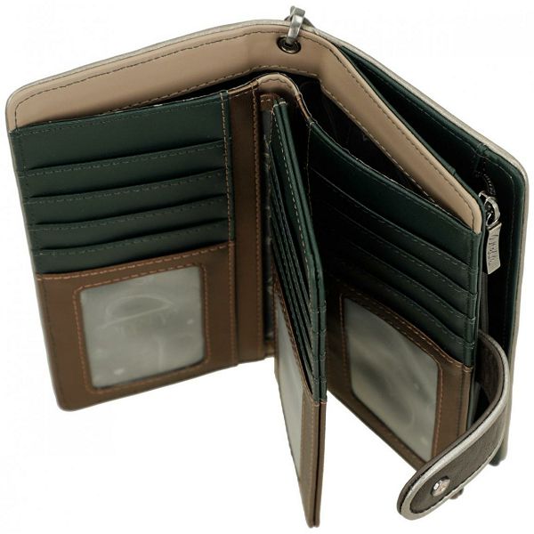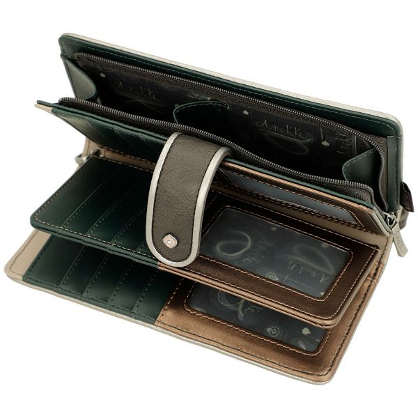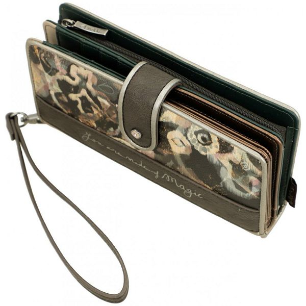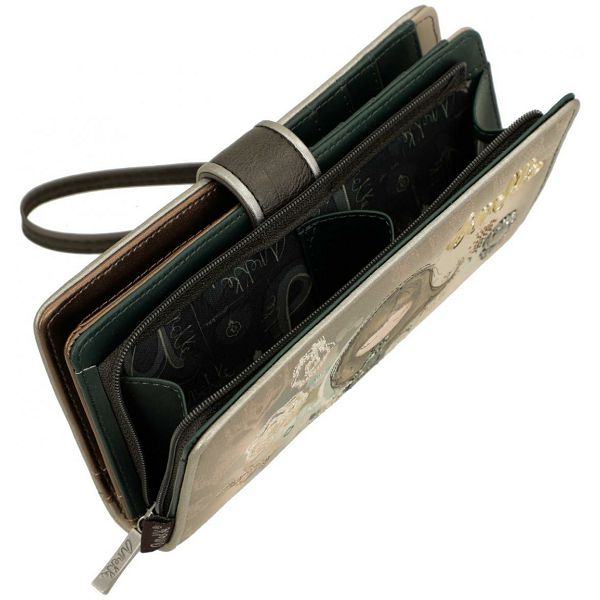 Ovaj prostrani ženski novčanik zatvara se preklopom i drukerom. Odvojivi remen za zglob omogućuje sigurno nošenje. Unutrašnjost je podstavljena tamno brončanom i tirkiznom bojom. Svaki pretinac je podstavljen odgovarajućom tkaninom.