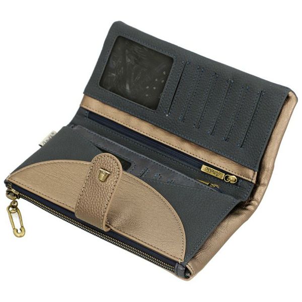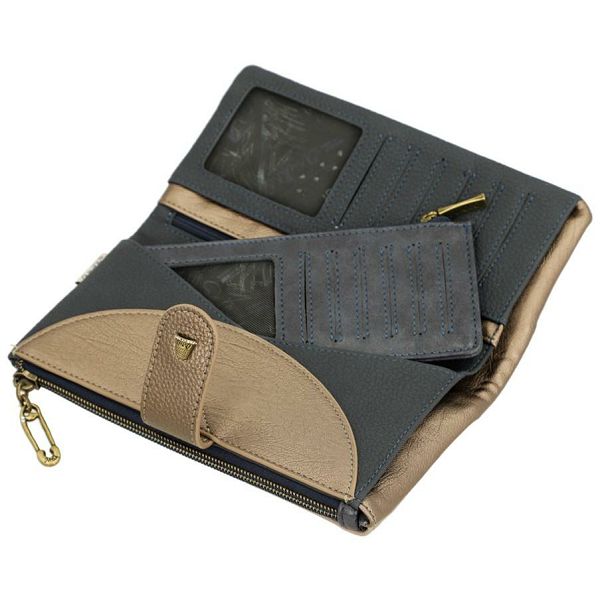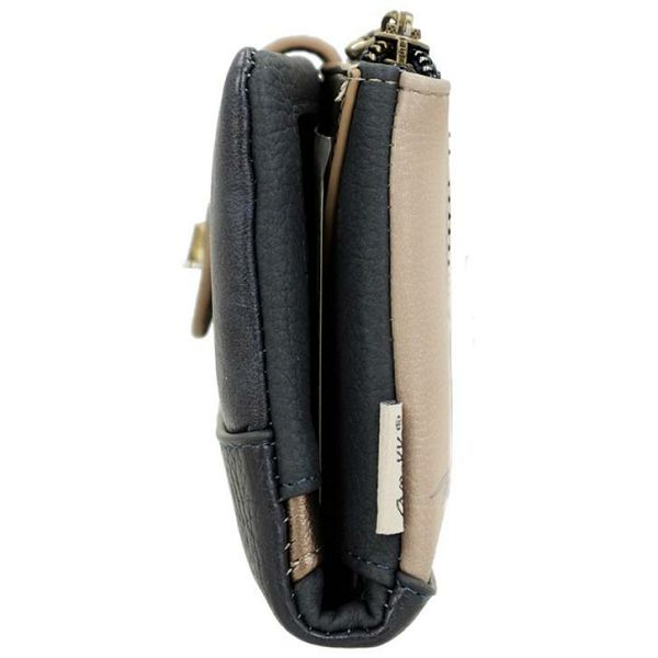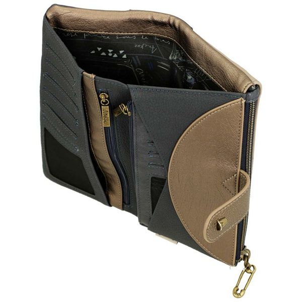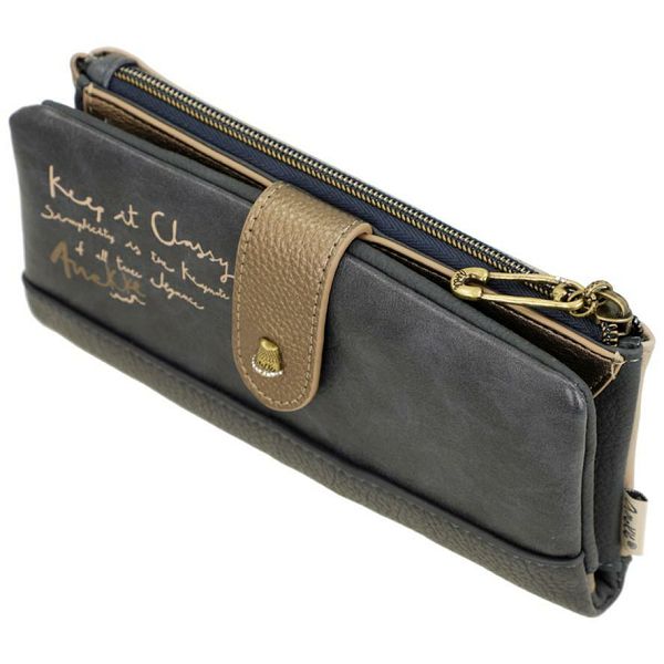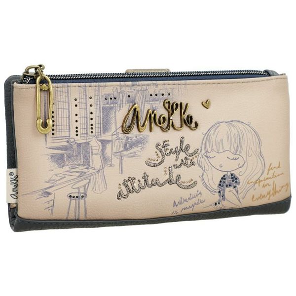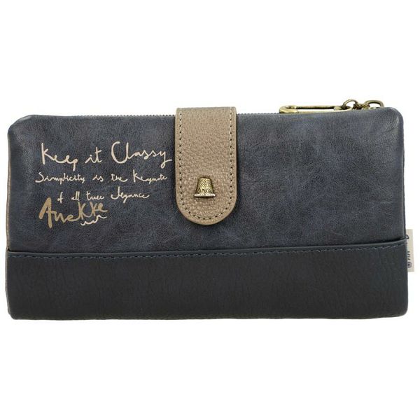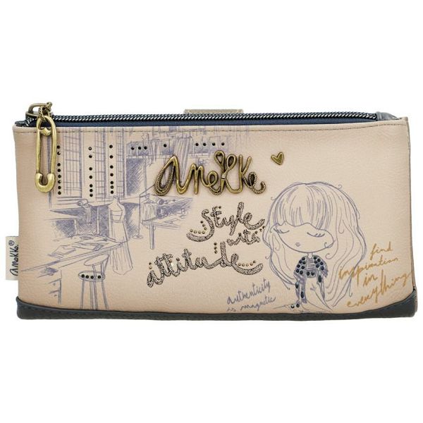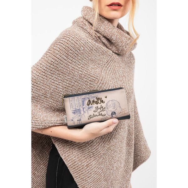 Prednja strana ovog novčanika krasi prepoznatljivi otisak brenda na glatkoj, modernoj taupe umjetnoj koži. Anekke, modna dizajnerica, u svom studiju pojavljuje se samo kao skica. Blistavi cirkoni i upečatljiv vez savršeno naglašavaju dizajn. Amblem brenda također se besprijekorno stapa s cjelokupnim dizajnom novčanika.