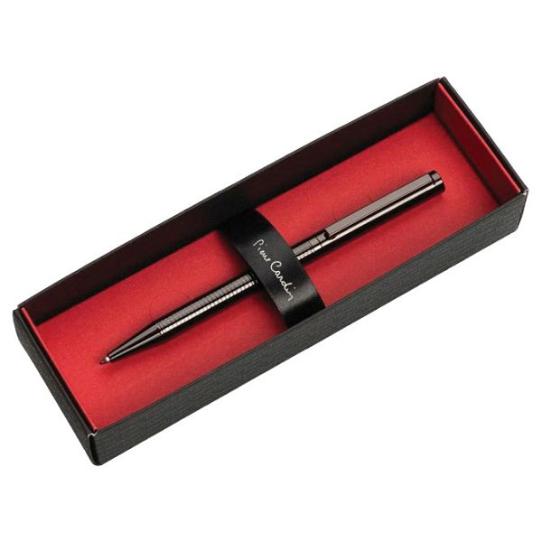Elegantna i glatka metalna kemijska olovka Pierre Cardin s rotirajućim mehanizmom. Tijelo olovke ukrašeno je gravurom u obliku šahovnice. Sadrži kvalitetno plavo punjenje s vrhom od 1 mm i jedno crno rezervno punjenje. Pakirano u poklon kutiji, dolazi s certifikatom autentičnosti.