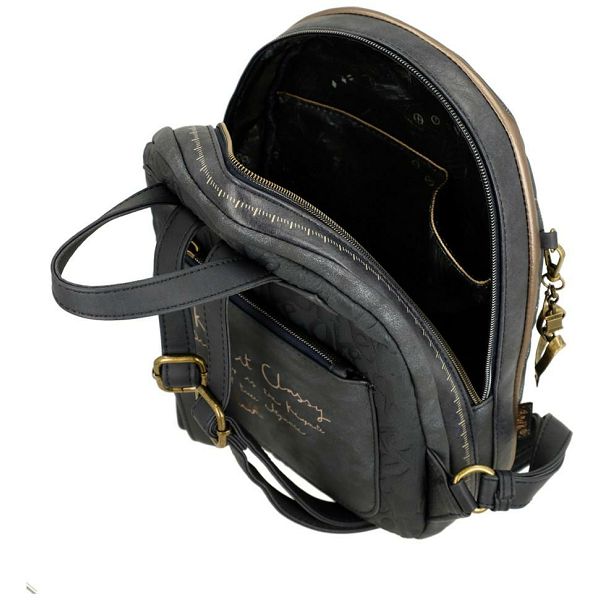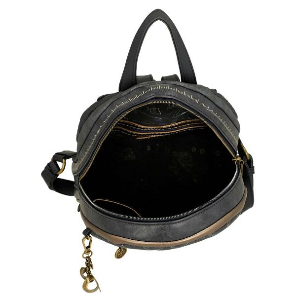 Ruksak je izrađen od glatke, tamnoplave umjetne kože. Prednja strana je ukrašena srebrnim svjetlucavim prošivanjem u obliku dijamanta. Suptilna svjetlucava završna obrada čini ovaj ženski ruksak pravim privlačnim za poglede. Prednji džep s patentnim zatvaračem ima tamno brončani metalni sjaj.
