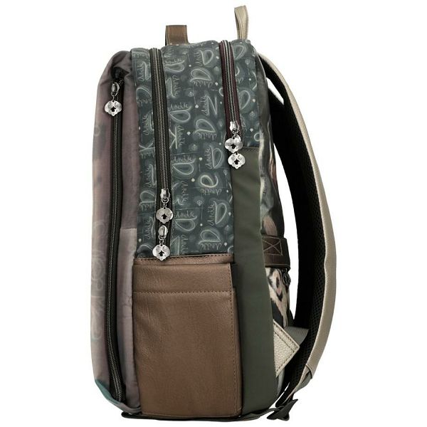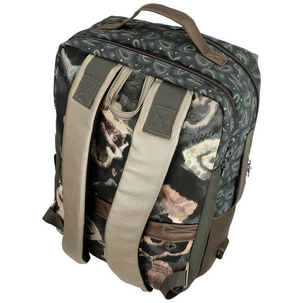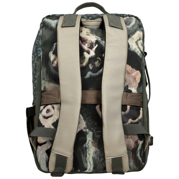 Ruksak je izrađen od lagane sintetičke tkanine u jesenskim bojama s detaljima od umjetne kože brončane boje. I prednja i stražnja strana imaju apstraktni print. Prednja strana ruksaka za prijenosno računalo također je ukrašena svijetlo zlatnim logotipom marke.