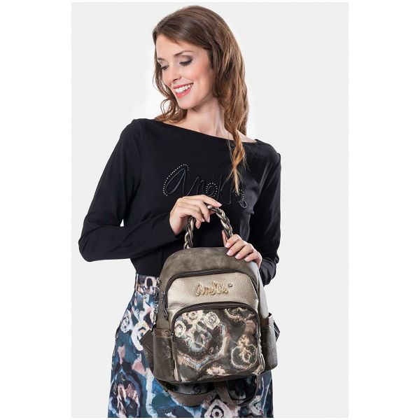 Ovaj jesenski ženski ruksak iz linije Manifesto izrađen je od umjetne kože s raznim teksturama površine. Prednji džep s patentnim zatvaračem ima upečatljiv print u tamnim bojama s apstraktnim oblicima, dodatno naglašen nježnim ukrasnim klinovima i metalnim detaljima. Zlatni umetak od zrnate umjetne kože ističe se zahvaljujući sjajnoj završnoj obradi. Amblem marke, ukrašen cirkonima, besprijekorno se stapa s dizajnom ruksaka.
