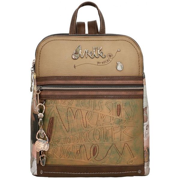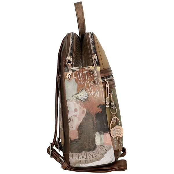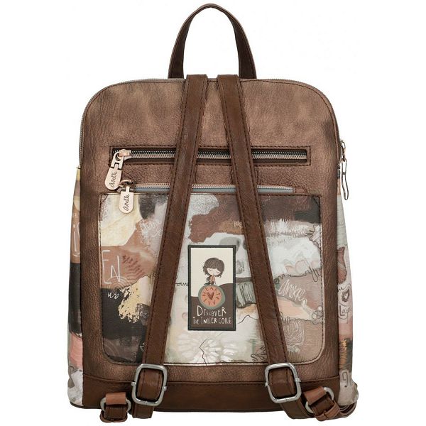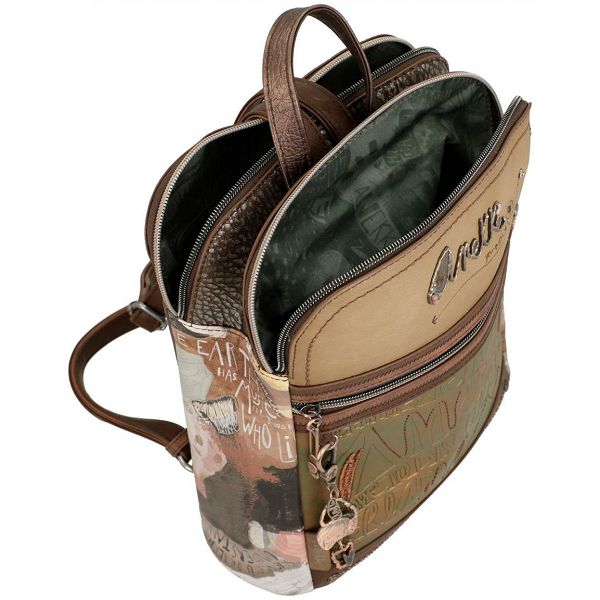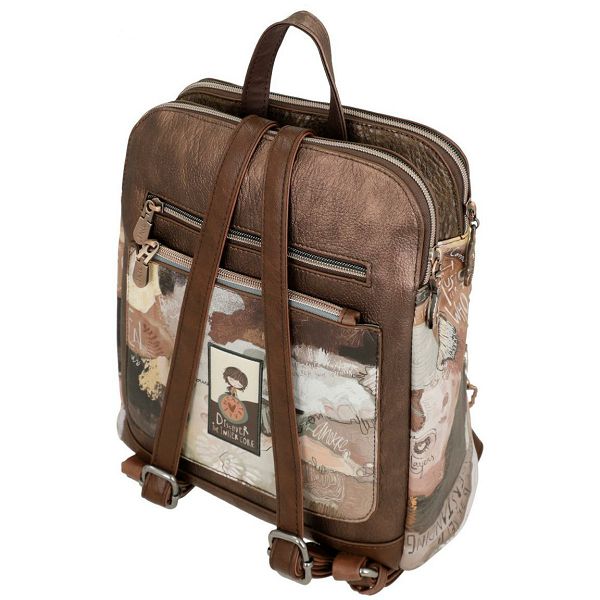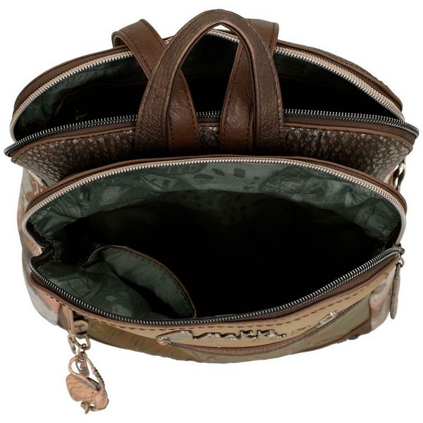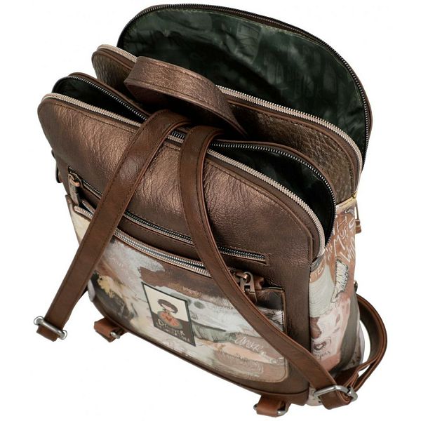 Ovaj ruksak s dva odjeljka izrađen je od djelomično svjetlucave imitacije kože. Prednja strana ruksaka, s metalnim završetkom, ima reljefni utisak. Različite nijanse smeđe boje skladno se stapaju, a dekorativni logotip marke savršeno nadopunjuje dizajn.