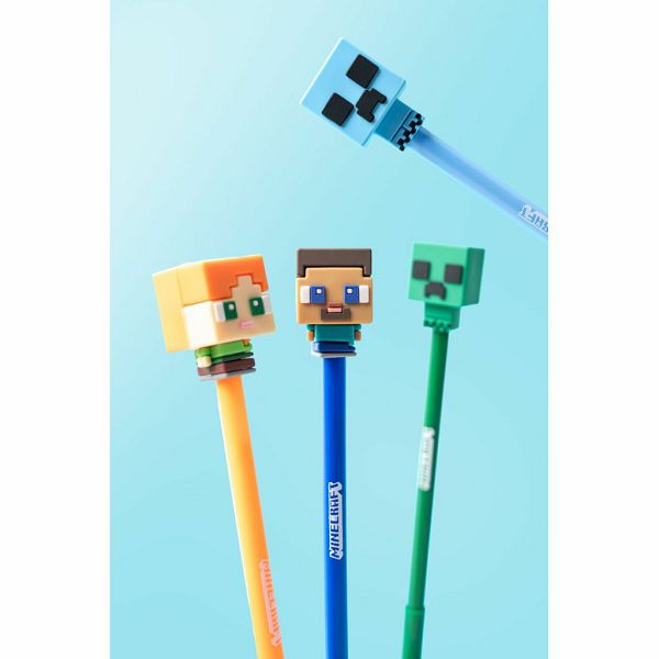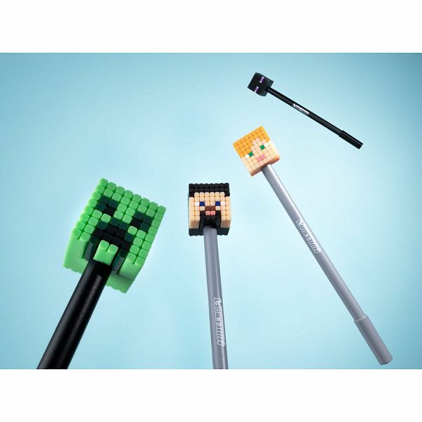 Set od četiri olovke s brisivom tintom i ukrasima Minecraft Chibi likova. Brisanje pomoću lika na vrhu olovke. Nije prikladno za djecu mlađu od 3 godine.