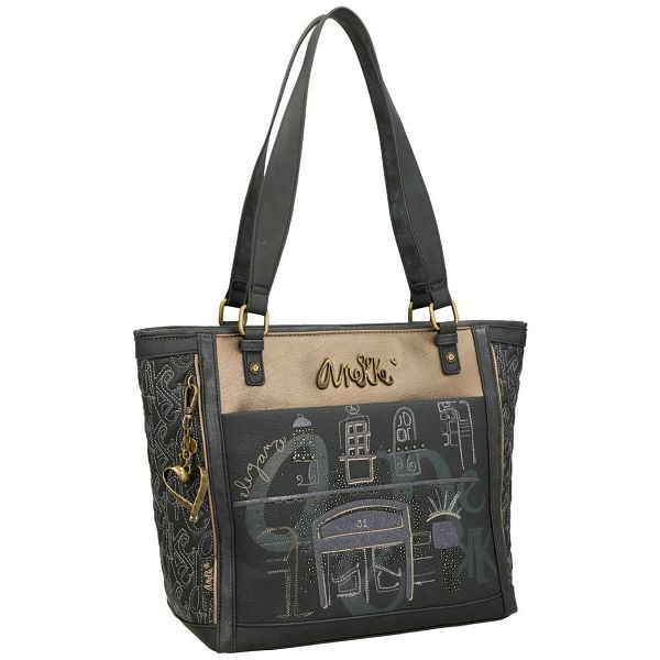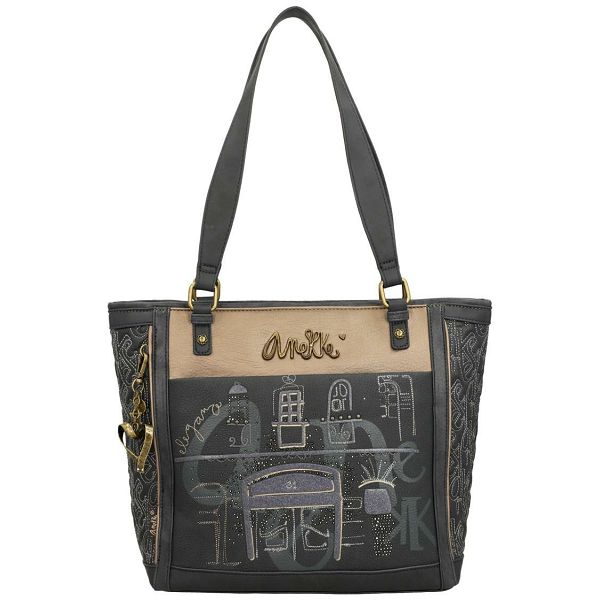 Ova platnena torba iz linije Boutique savršen je suputnik u kupovini. Prostrana torba izrađena je od zrnaste umjetne kože u trendi tamnoplavoj boji. Prednja strana torbe za kupovinu ima dizajn izloga stvoren kombinacijom tiska, utiskivanja i veza. Blistavi cirkoni dodatno naglašavaju motiv.