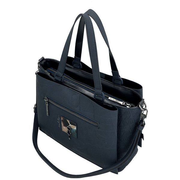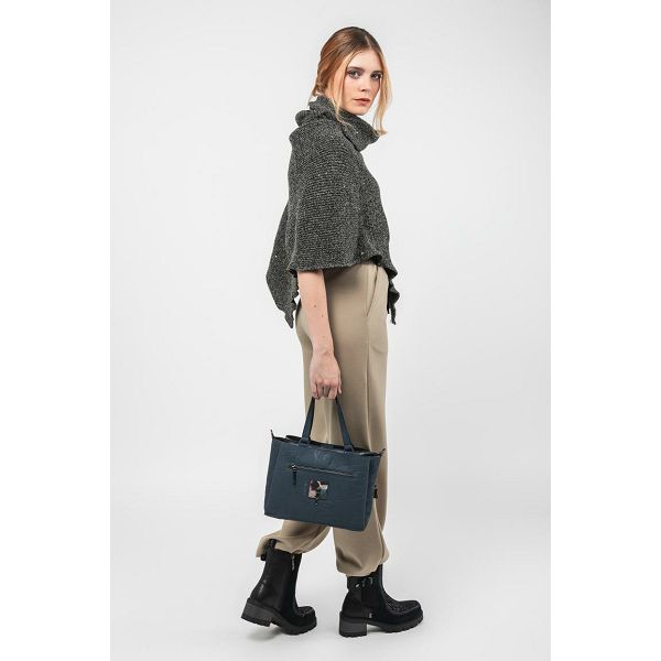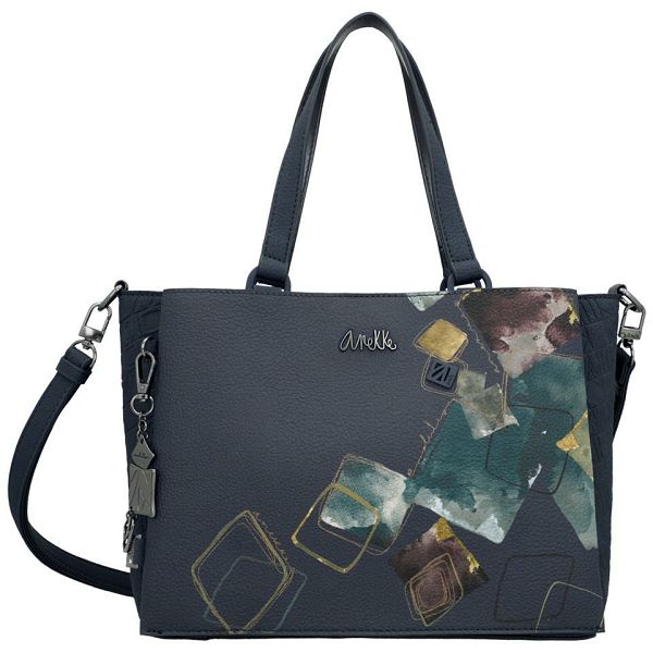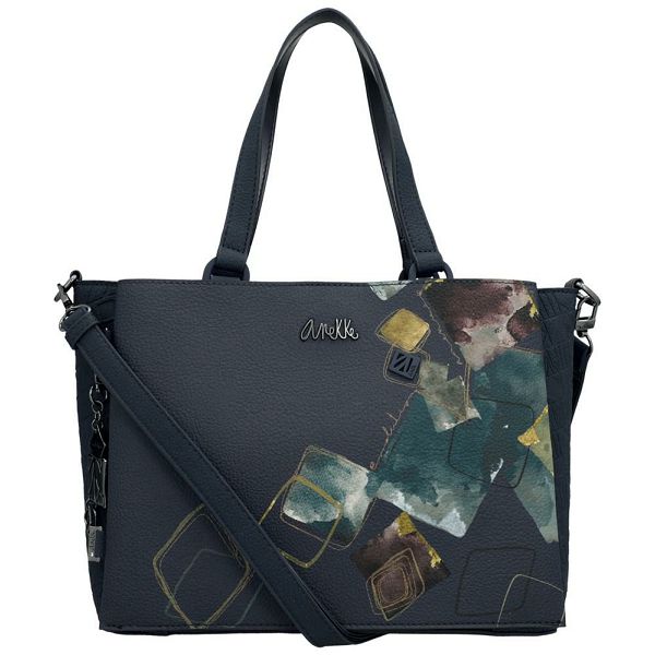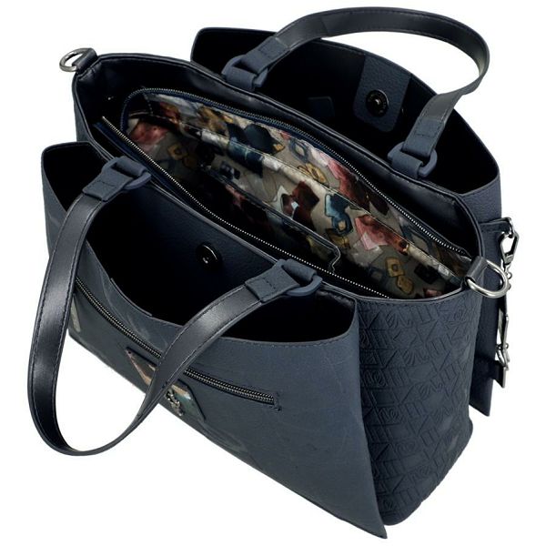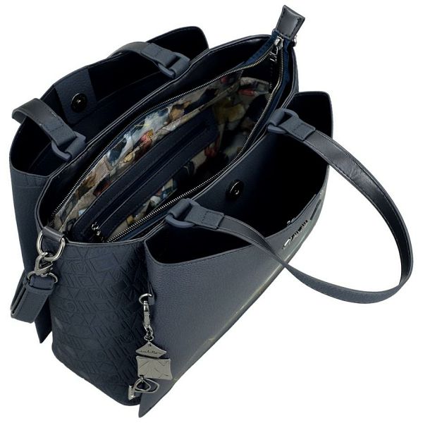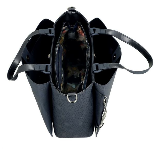 Torbica je izrađena od zrnaste umjetne kože u tamnoplavoj boji. Upečatljiv print apstraktnih elemenata krasi prednju stranu torbe, odmah privlačeći pažnju. Suptilni amblem brenda savršeno se stapa s gotovo minimalističkim dizajnom.