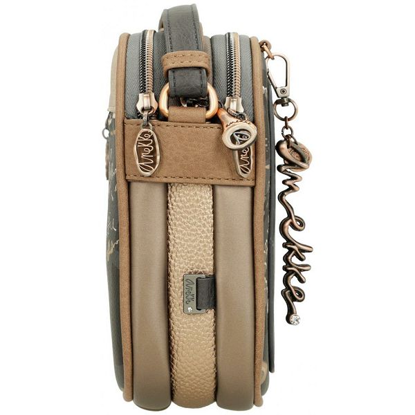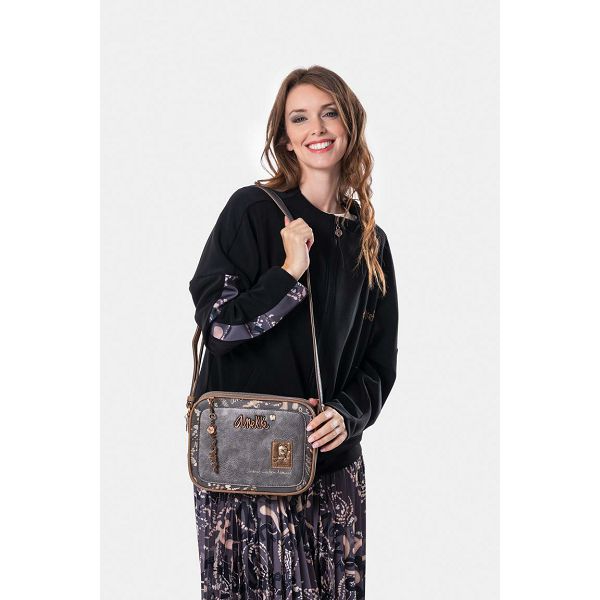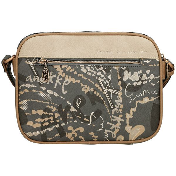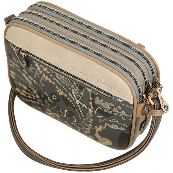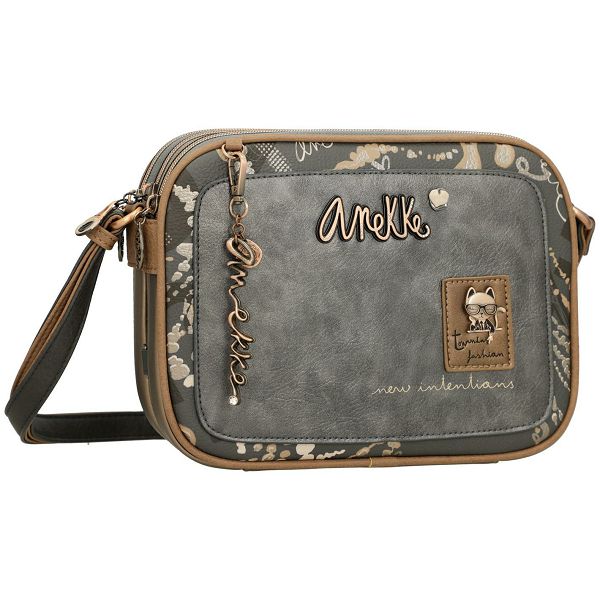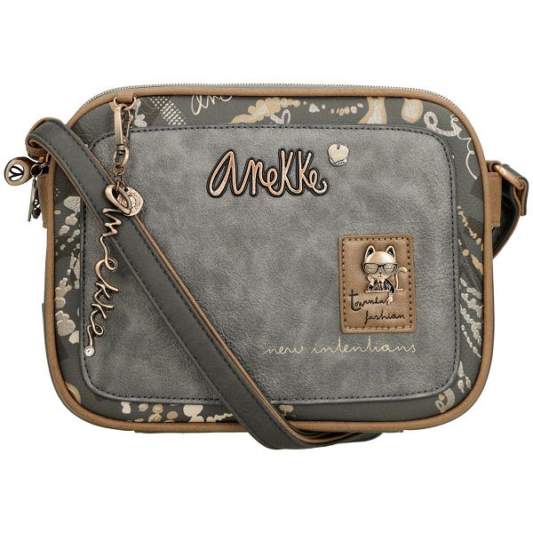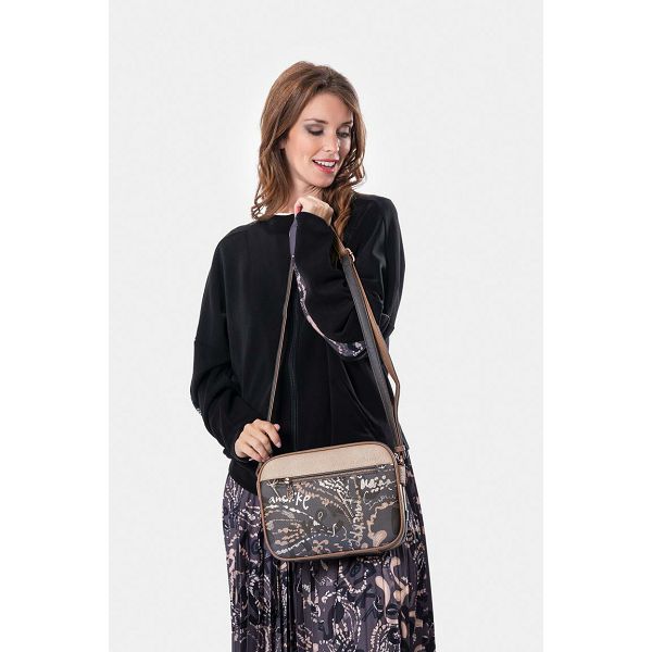 Prednja strana torbe preko ramena je relativno jednostavna i završena u metalik, svjetlucavoj antracit boji. Samo okvir ima apstraktni print u prigušenim bojama. Amblem marke ukrašen cirkonima i mala metalna pločica s mačkom Towandom pružaju kontrastni element.