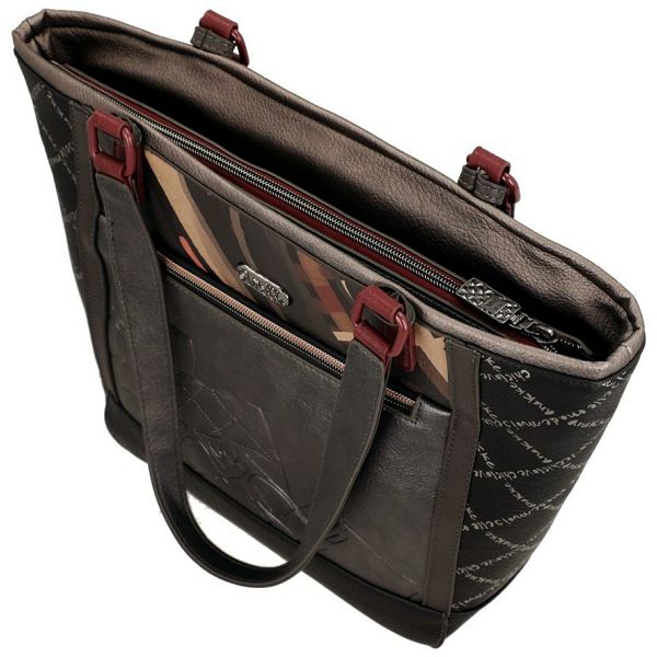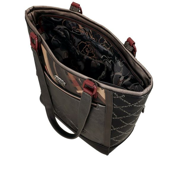 Ova torbica je istovremeno funkcionalna i elegantna. Stražnja strana ima print u ugodnim zemljanim tonovima, upotpunjen metalik, svjetlucavom antracit umjetnom kožom. Skladna interakcija prigušenih boja, naglašena bogatom bordo bojom.