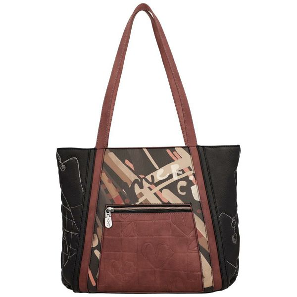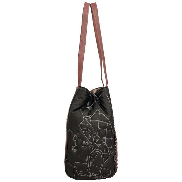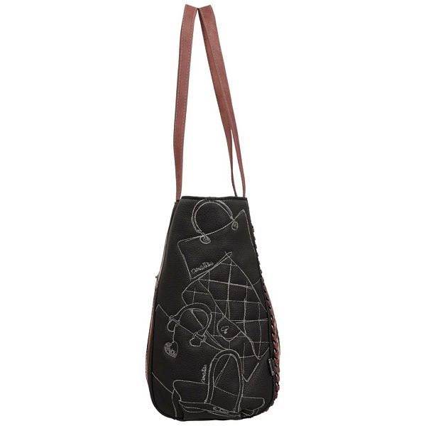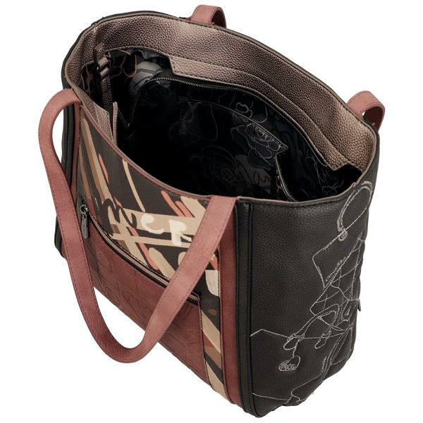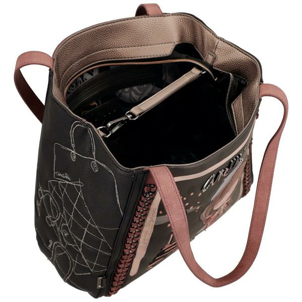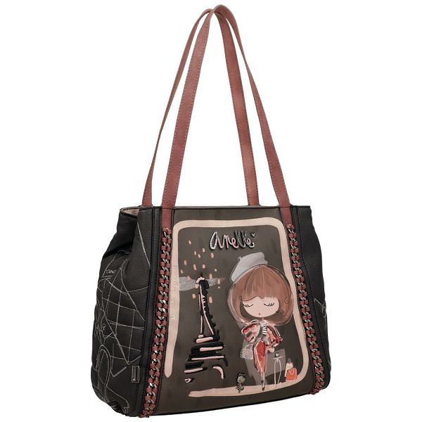Ova izvanredna torba za kupovinu pretvorit će vaš ured u modnu pistu! Izrađena od glatke i zrnate umjetne kože u crnim i prigušenim jesenskim bojama, torba ima prepoznatljivi print na prednjoj strani. Ovaj put, Anekke se predstavlja u elegantnom pariškom šiku, u pratnji svoje vjerne prijateljice Towande. Dizajn je naglašen nježnim vezom i malim ukrasnim klinovima. Upečatljiv izvezeni Eiffelov toranj, savršeno usklađen bojom s crno-prašnjavim amblemom brenda - ružom, dodaje poseban šarm torbi. Dva metalna lanca, pričvršćena za torbu remenima od umjetne kože, još su jedan detalj koji privlači pažnju.