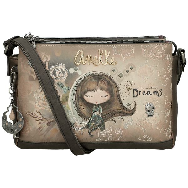 Ova torba za rame izrađena je od glatke umjetne kože u jesenskim nijansama bež i taupe boje. Prednja strana torbe krasi kultni print sanjive Anekke. Nježni vez, svjetlucavi cirkoni i upečatljive ukrasne zakovice savršeno ističu motiv. Zlatni amblem brenda s integriranim svjetlucavim elementima također se savršeno usklađuje s dizajnom torbe za rame. Naravno, uključena je i Anekkeina vjerna suputnica, Towanda. Može se pronaći kao mala metalna aplikacija na prednjoj strani torbe za rame.